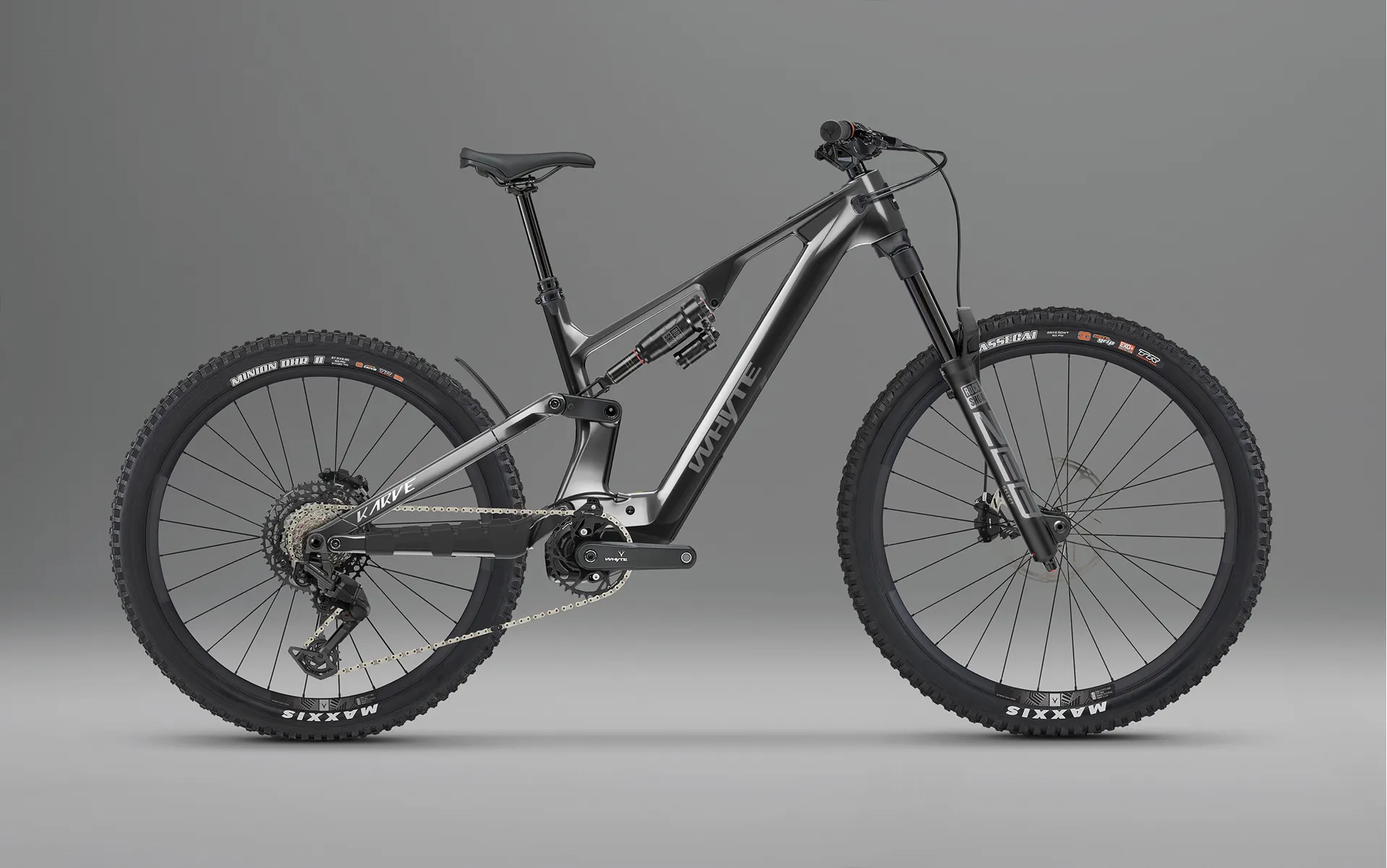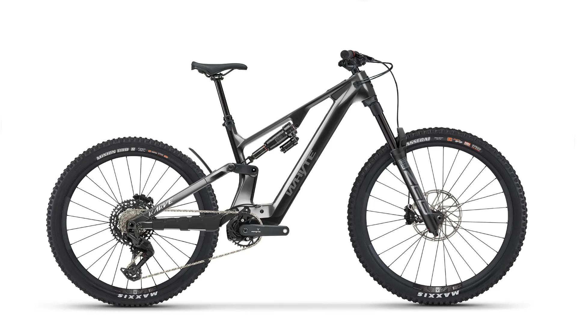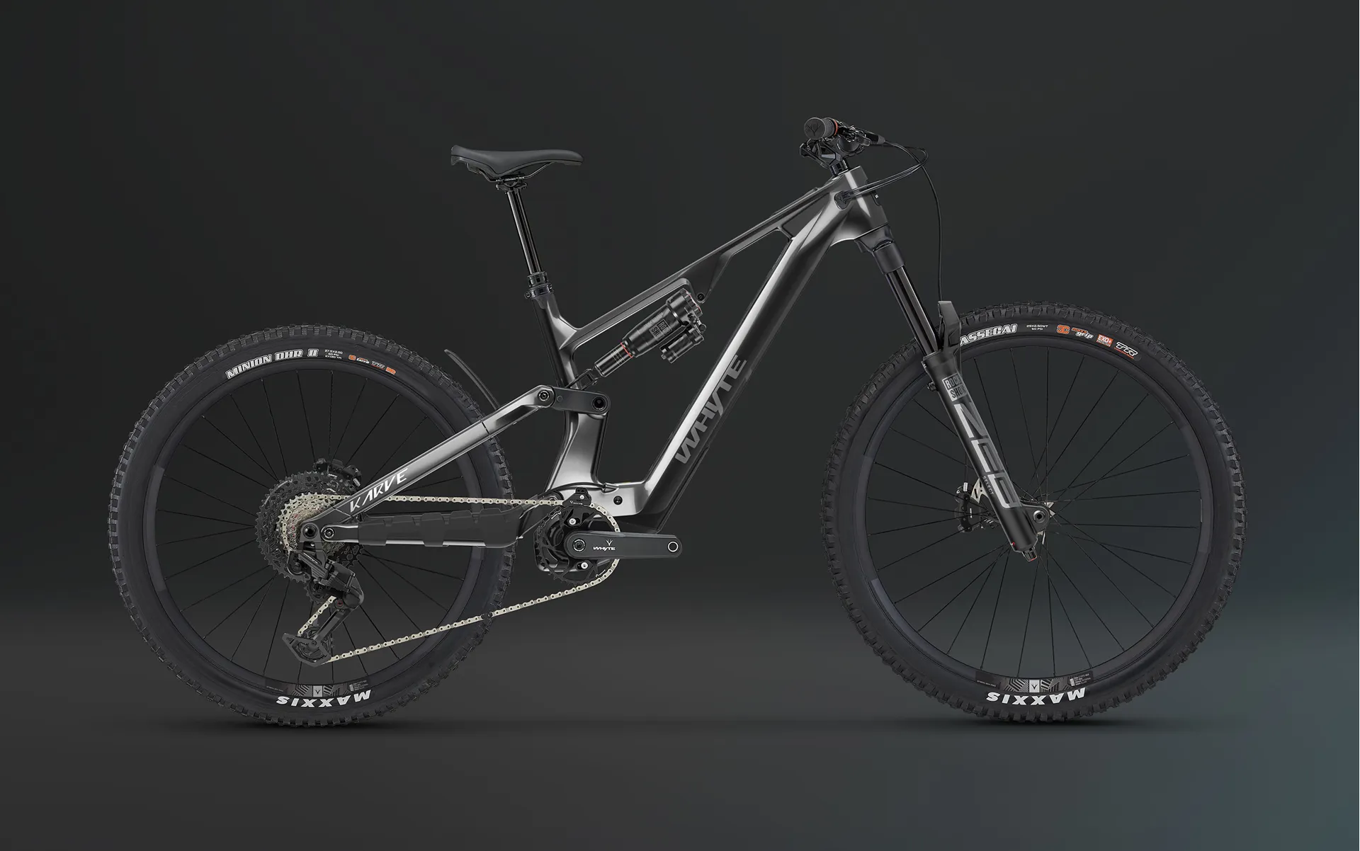 Maxxis Assegai WT, TR, 29 x 2.5in 120TPI, EXO+ Sidewall Protection, 3C MaxxGrip, Dual Compound, folding bead (front); Maxxis Minion DHR 2 WT, TR, 27.5 x 2.5in 120TPI, Double Down casing, 3C MaxxTerra, Dual Compound (rear)